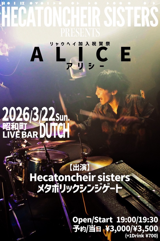 Hecatoncheir sisters pre. ALICE (アリシー) SCHEDULE 2026/03/22(日) 昭和町 Live Bar DUTCH Hecatoncheir sisters メタボリックシンジゲート 3,000円+1ドリンク(700円) チケットはコチラ! URLをコピーする 報告する